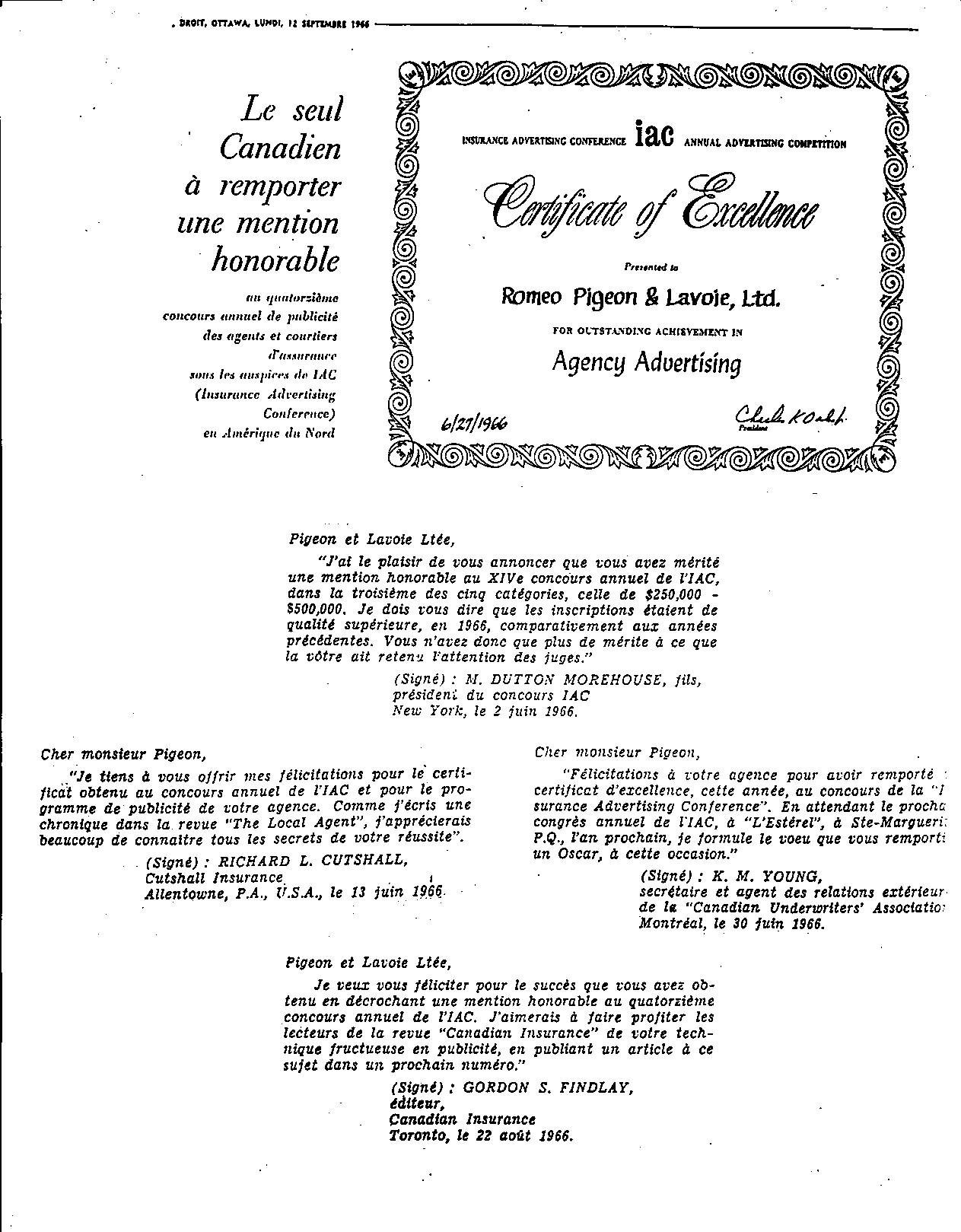 Vers 1959, le Cie Roméo Pigeon Lavoie trouva logement à la mesure de son prestige. Ce fut au 569 McArthur. Son prestige en effet était chose connue des Associations et des Journaux d’Assurances en Ontario et aux États Unis. Nous en avons la preuve dans la remise qui lui fut faite en 1966 du Certificate of Excellence et par les lettres de félicitations des grands de l’Assurance de New York, Montréal, Toronto et Allentowner, U.S.A.. Le Certificate of Excellence décerné par ICA a des appréciations très élogieuses à l’adresse de Roméo. (Le journal le Droit commente : « Le seul Canadien à remporter une mention honorable au quatorzième concours annuel Annual Avertising Competition »)