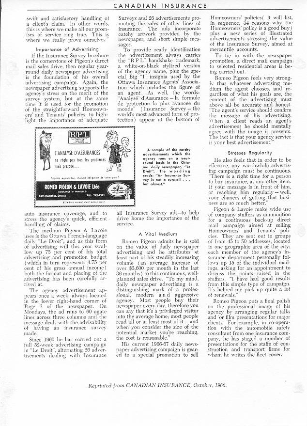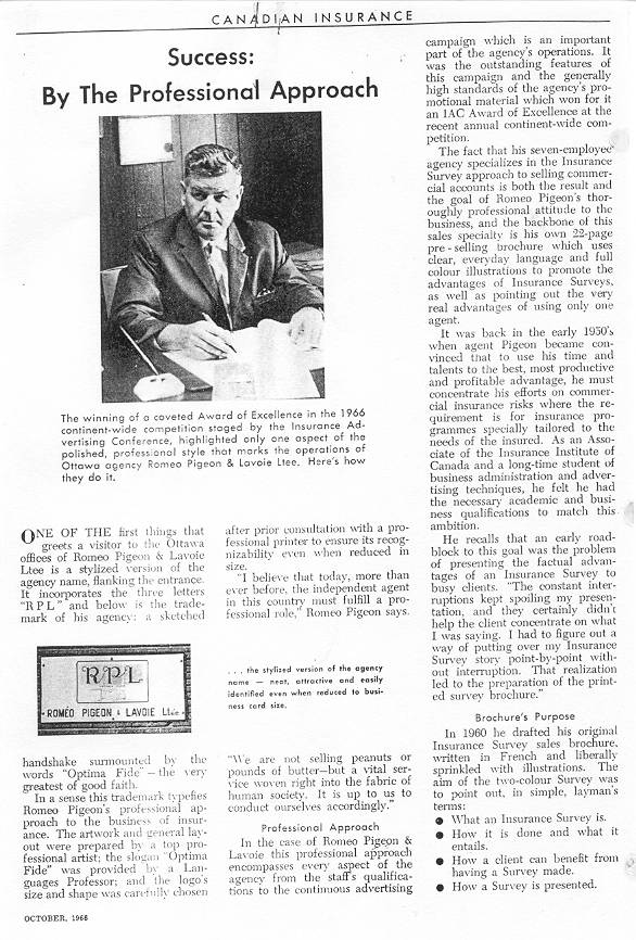 Mieux encore, le Canadian Journal of Insurance Management and Marketing, en octobre 1966, publia un long article de trois pages intitulé SUCCESS: BY THE PROFESSIONAL APPROACH Page 1, Page 2, Page 3. On nous présente Roméo comme au sommet de sa carrière et donc en mesure d’aviser les gens de sa profession. Ceux de la famille et de ses enfants qui voudront comprendre l’esprit avec lequel Roméo entreprit et mena à bien sa fondation n’auront qu’à prendre connaissance de cet article (contacter France Gignac pour vous en procurer une copie). On peut résumer la pratique professionnelle de Roméo par: Honnêteté et sérieux dans l’Enquête qui détermine le niveau de protection requis, (Roméo publia une brochure de 22 pages sur ce seul sujet), Honnêteté dans la fixation de la prime, honnêteté et service prompt dans l’attention aux réclamations, Honnêteté dans la publicité: n’avancer que ce qu’on peut livrer.... .C’est ce que les collègues appellent le professionnalisme.