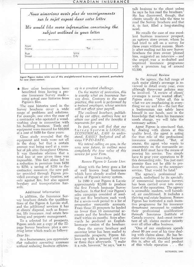 Vers 1959, le Cie Roméo Pigeon Lavoie trouva logement à la mesure de son prestige. Ce fut au 569 McArthur. Son prestige en effet était chose connue des Associations et des Journaux d’Assurances en Ontario et aux États Unis. Nous en avons la preuve dans la remise qui lui fut faite en 1966 du Certificate of Excellence et par les lettres de félicitations des grands de l’Assurance de New York, Montréal, Toronto et Allentowner, U.S.A.. Le Certificate of Excellence décerné par ICA a des appréciations très élogieuses à l’adresse de Roméo. (Le journal le Droit commente : « Le seul Canadien à remporter une mention honorable au quatorzième concours annuel Annual Avertising Competition »)